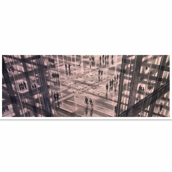 Las obras que les comparto no están dispuestas cronológicamente sino conectadas por el hilo de mis intereses: es la materialidad del carbón, con sus trazos, manchas, puntos y borrones, la que da lugar a espacios y personajes que surgen al unísono del recuerdo y del movimiento de la mano. Presento ciudades abducidas y circunstanciales donde la gente se mueve como una aparición. Pienso en la caída de la lluvia intensa e intermitente de Bogotá y en la caída de la luz, que perros callejeros quisieran atrapar. En estos escenarios, distópicos o idílicos, se integran fachadas, horizontes y personajes anónimos que, como manchas, se forman, se transforman o desaparecen.