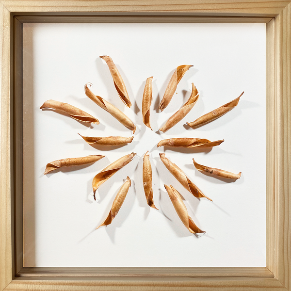 Información: Dibujo a lápiz, hojilla de oro, pintura y semillas, hojas o material orgánico sobre papel canson