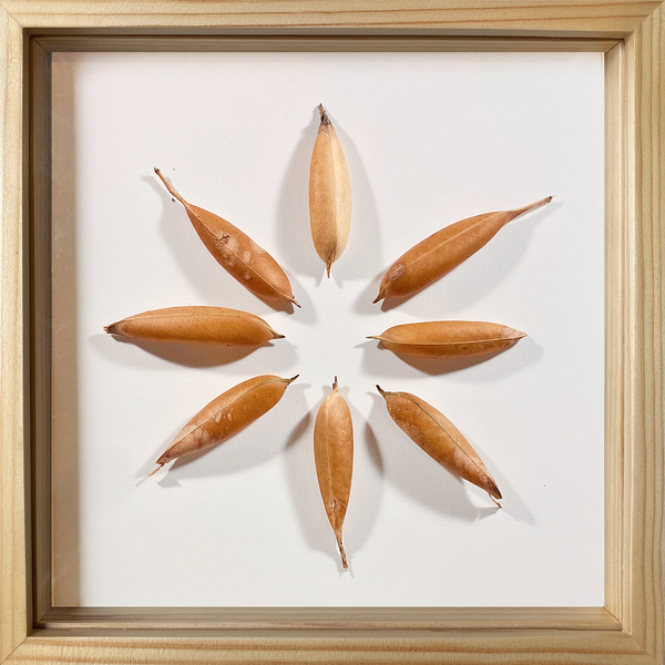 Información: Dibujo a lápiz, hojilla de oro, pintura y semillas, hojas o material orgánico sobre papel canson