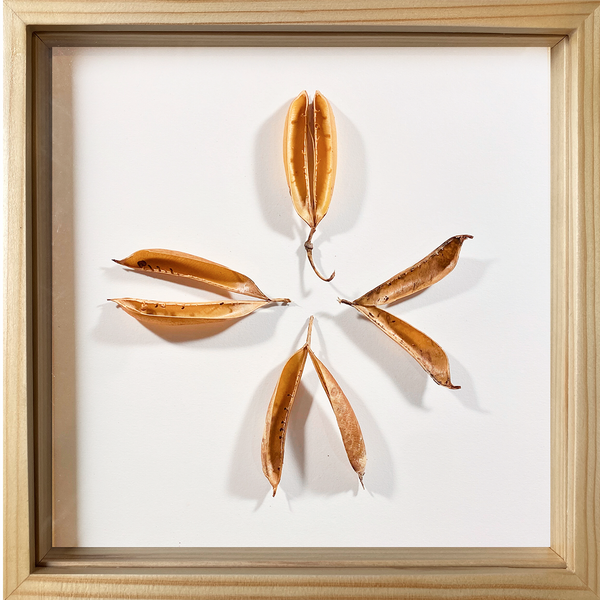 Información: Dibujo a lápiz, hojilla de oro, pintura y semillas, hojas o material orgánico sobre papel canson